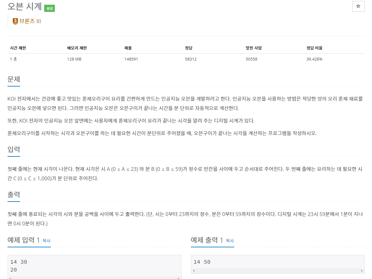 시와 분을 받고 요리에 걸리는 분수를 받아 계산하여 24시간을 기준으로 시간을 적어 출력하는 문제