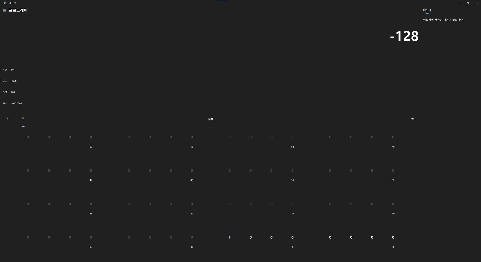 크기는 2^8이지만 음수의 값도 표현하기 위해 제일 큰 자릿수는 양수 음수를 표현한다