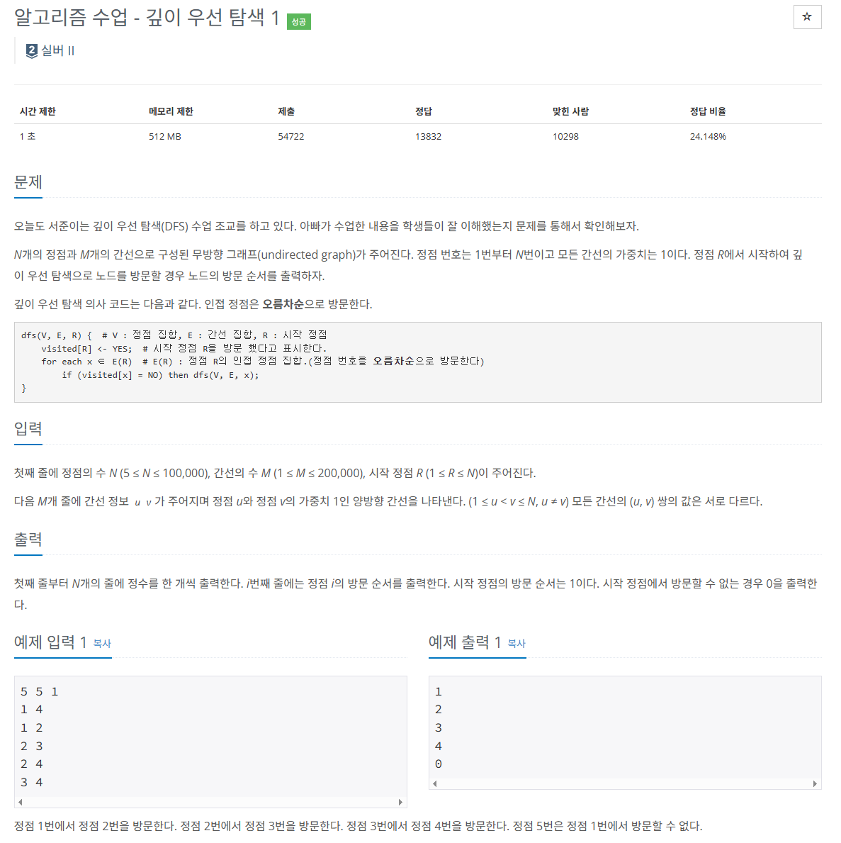 단계별로 풀어보기 - 그래프와 순회 단계 - 24479번 알고리즘 수업 - 깊이 우선 탐색 1 문제이다.
